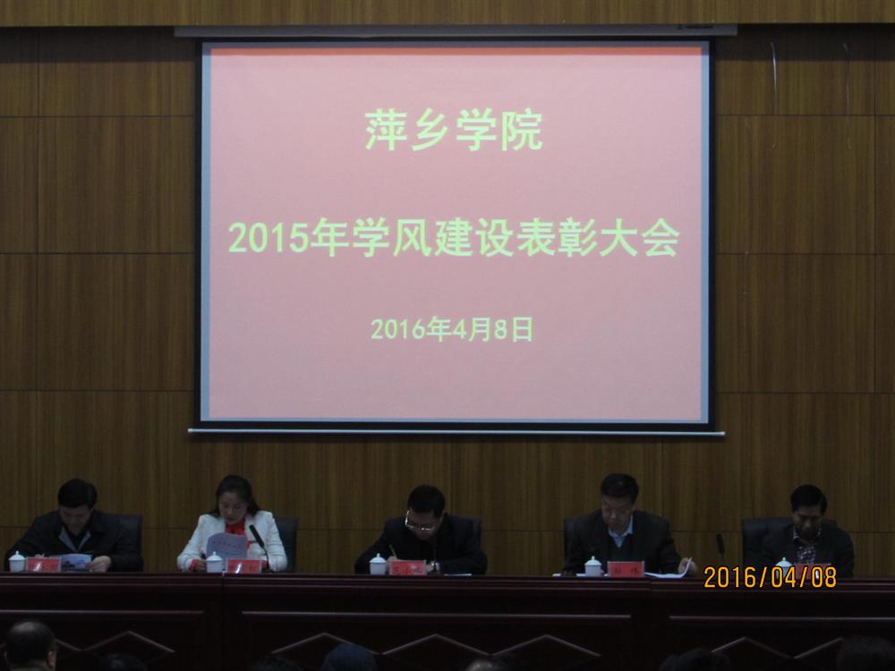 2016年4月8日14:00,在萍乡学院学术报告厅召开了萍乡学院2015年学风建设表彰大会,经各学院推荐,学校学风建设领导小组办公室认真考评审核,并经校长办公会研究,决定对2015年学风建设先进集体和个人予以表彰。出席本次会议的主要领导有院长范小林、副院长郭伟、副院长田常红、副院长刘卫林、宣传统战部部长陈永国。