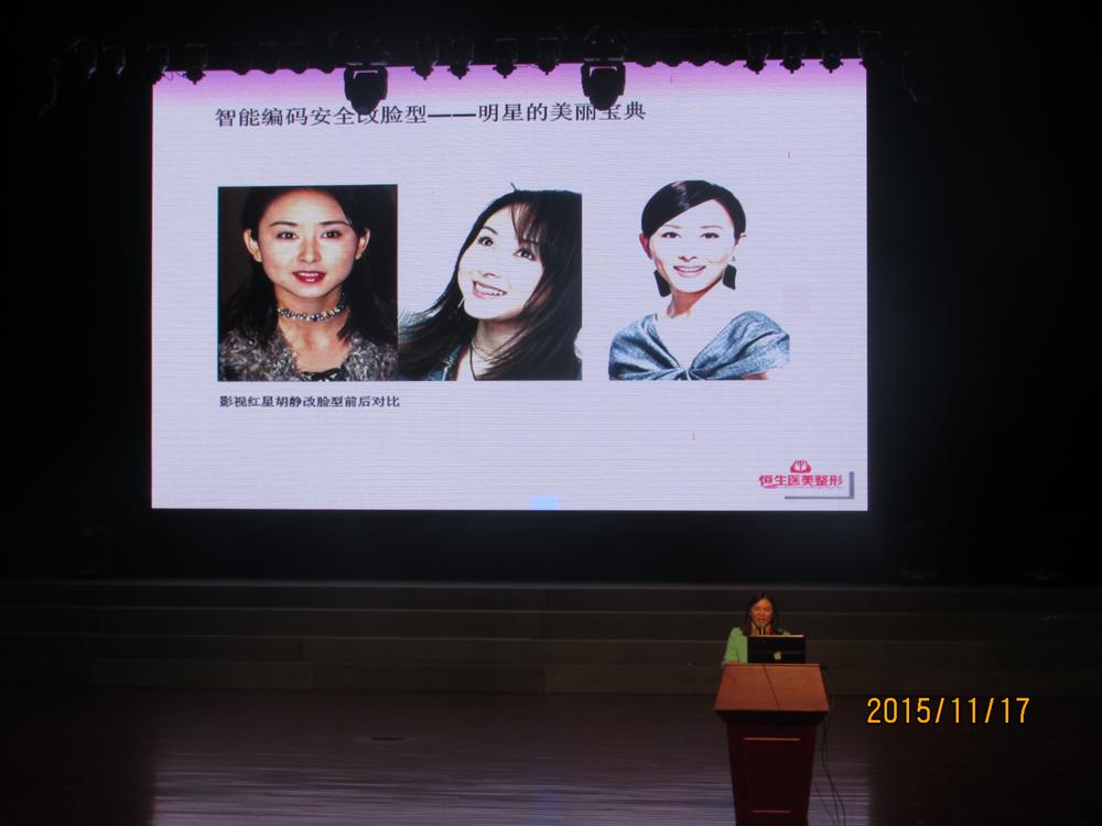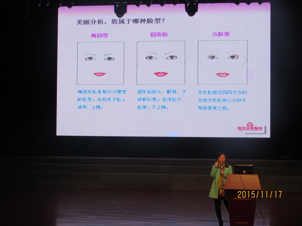 在讲解完内在的保养后,第二项议程开始进行,由黄金老师给我们带来一些专业的医美整形的知识。随着大屏幕上一张张对比的脸,我们了解到改变脸型的方式,了解到专业的整形知识,了解到漂亮的脸蛋通过后天的努力也可以形成。让我们开始琢磨自己的脸蛋,思考它属于什么类型。