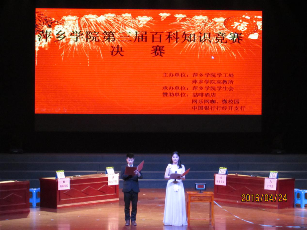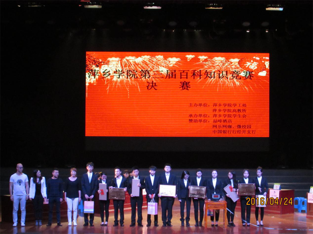 2016年4月24日晚7点,由萍乡学院学工处和高评所主办、萍乡学院校学生会承办的萍乡学院第三届百科知识竞赛决赛在音乐厅隆重举行。出席的嘉宾有萍乡学院学工处处长叶国许、高评所所长易志文、学工处副处长丁勇、校学生会指导老师何继辉、高评所指导老师刘艳军,微校园黄康林先生,网乐网咖刘女士,中国银行经开支行晏向荣副行长。各个组织代表以及各二级学院学生代表也观看了此次比赛。
