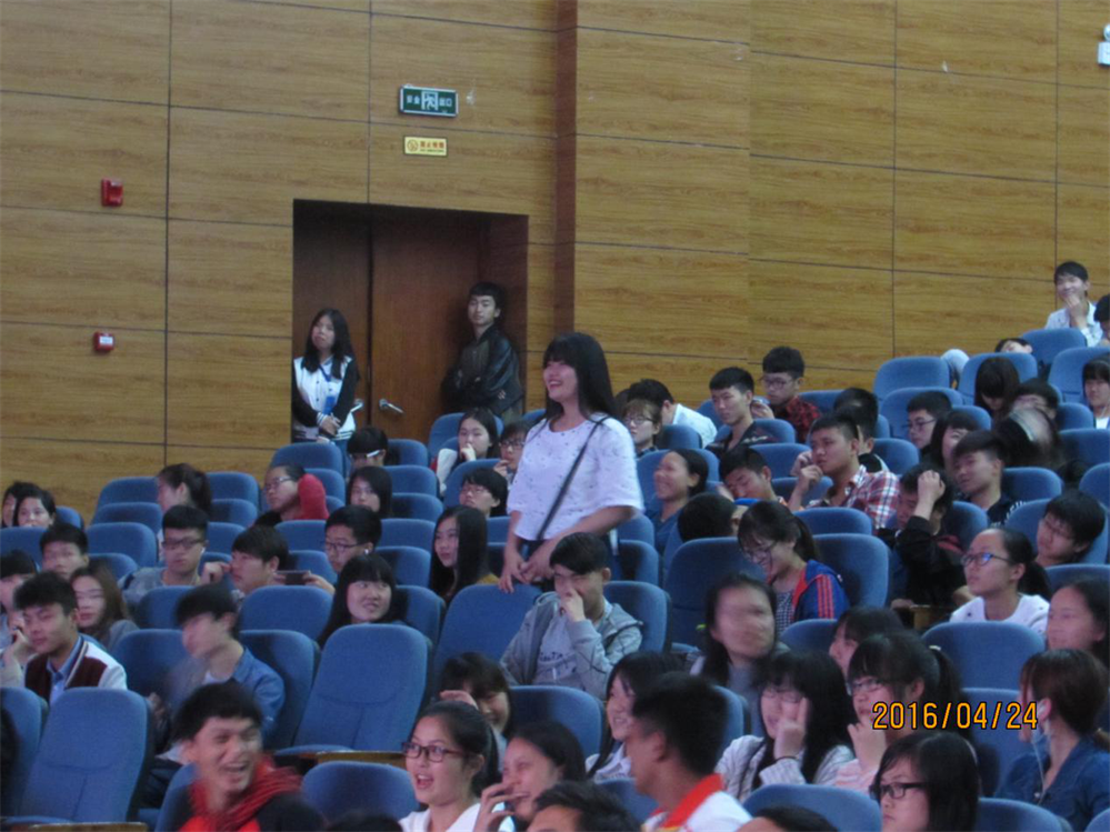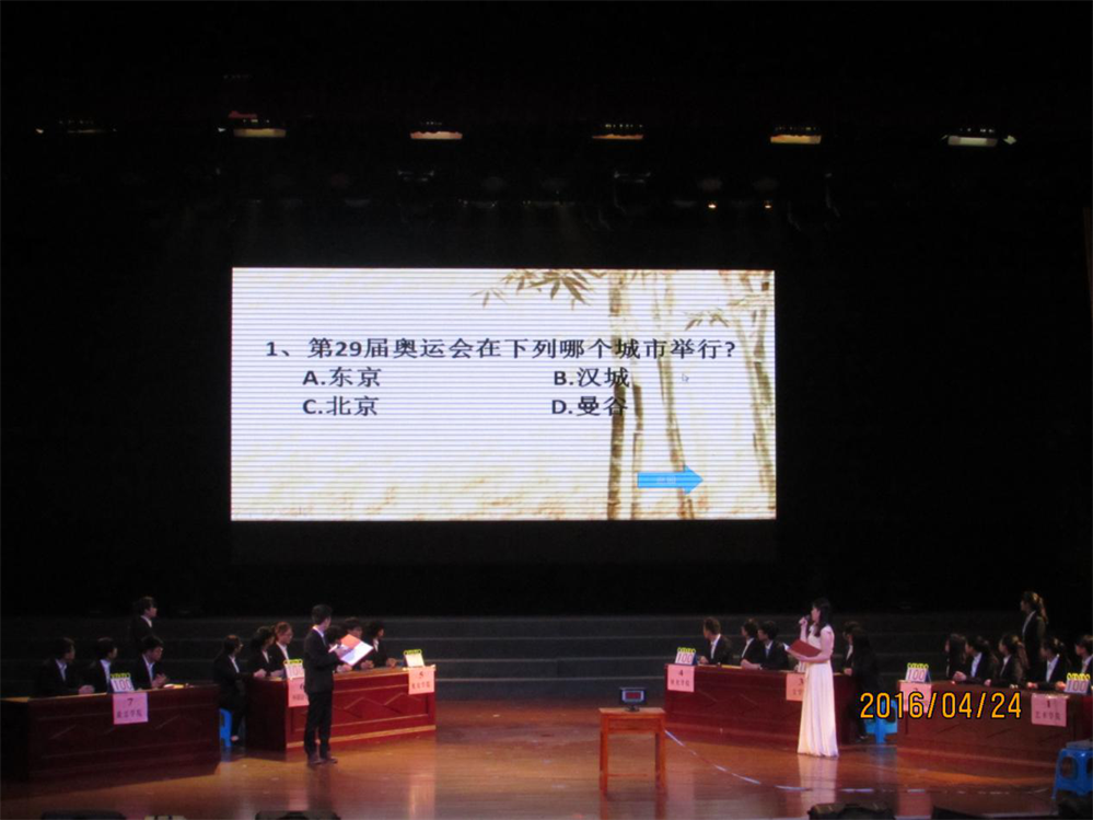 比赛正式开始,第一环节是必答题,以100分为起点分,每队回答一个必答题轮流回答两轮。第二环节是抢答题,参赛选手们利用抢答器进行抢答。抢答题完全点燃了现场紧张的气氛,双方充分发挥自己的智慧与团队合作,展开激烈的竞争。第三环节仍然是必答题。紧接着第四环节又是我们的抢答题,第五环节是风险题,难度大大升级,由参赛队伍自行选择分值为30或者50分的题目,然后根据所选择的分值序号对应的题目作答。场上角逐激烈,参赛队伍各不相让。经过激烈的比拼后,由于机电学院与外国语学院分数相等,我们进行了令人心情澎湃的加时赛。在比赛中还穿插了互动环节,凡是参赛队伍答错的题目,均由在场的同学们来举手抢答,答对者即送有精美礼品一份。此环节再次将会场气氛推上高潮,台上台下都积极踊跃参与到活动中来。大家热情高涨,不亦乐乎。