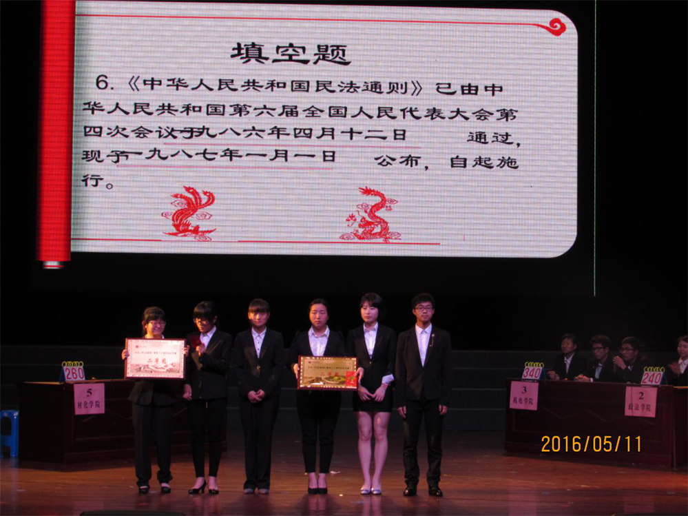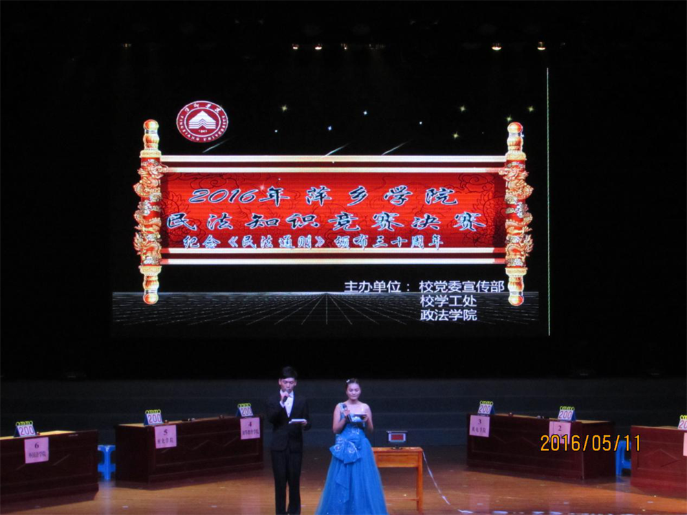 2016年5月11日晚上7点,在萍乡学院音乐厅举办了纪念《民法通则》颁布三十周年的民法知识竞赛,本次大赛由学工处和政法学院联合策划。莅临本次大赛的嘉宾有宣传统战部部长陈永国、学工处处长叶国许、政法学院党总支书记叶继林等,评委有张洪峰老师、易亮老师、陈冉老师。