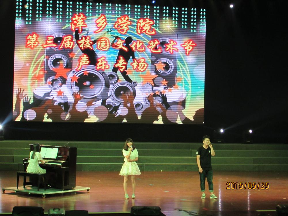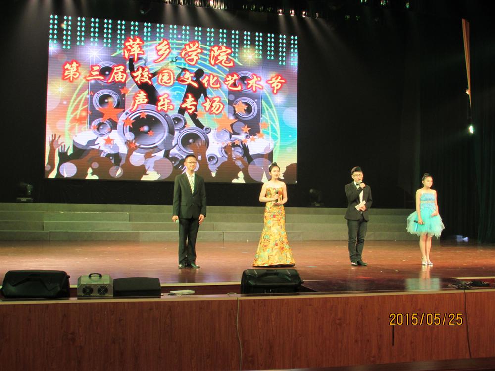 2015年5月25号晚7点,萍乡学院第三届校园文化艺术节声乐专场于音乐厅拉开帷幕,莅临本次声乐专场的领导有萍乡学院学工处处长叶国许,担任此次比赛的评委有艺术系游建辉老师,艺术团陈光明老师,教育科学系张芦菲老师,教育科学系二部刘莎老师。出席本次声乐专场的嘉宾为五大组织,四大媒体负责人以及各系部主席。观众井然有序地入场就座,在专场倒计时1分钟时,全场寂静,一切准备就绪。
