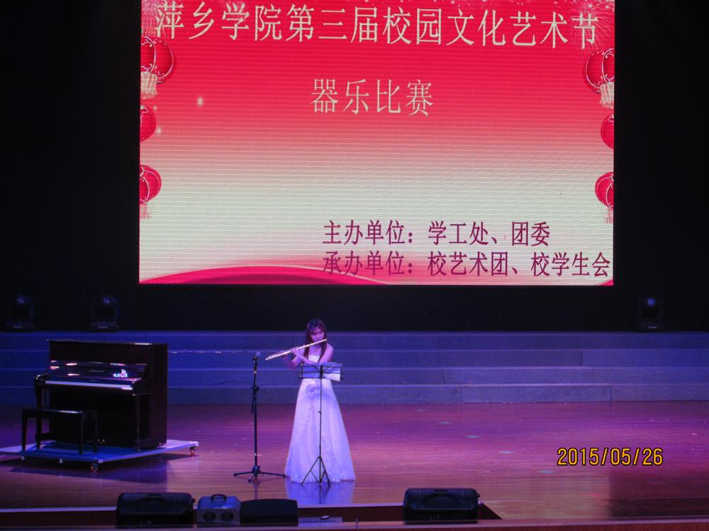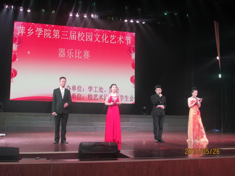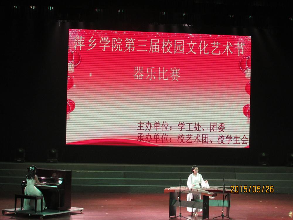 2015年5月26日晚上7:00,由萍乡学院学工处、校团委主办,校艺术团、校学生会承办的萍乡学院第三届校园文化艺术节器乐专场在音乐厅隆重拉开帷幕。担任此次大赛的评委有艺术系的付红玲老师、教育科学系二部的胡予萍老师、教育科学系的罗娜老师、教育科学系二部易红霞老师。各系(部)主席以及各系(部)学生代表也出席观看了此次大赛。