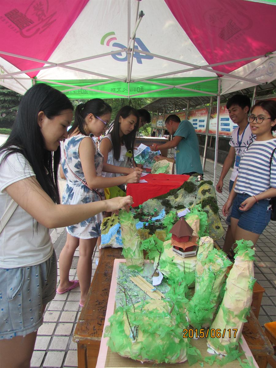 此次站点活动与前两站有所不同,校学生会成员在中心小广场举办阳光体育第三站——张家界的模型大赛活动。以十二个系(部)为单位,分别制作了十二个张家界的模型,然后在小广场展示出来,由全校学生对这些模型进行投票。投票方式有两种,微信上投票或者现场投票。只要参与投票并且关注了校学生会微信号的学生就会免费获得一张价值25元的电影代金券。现场气氛热闹非凡,此次活动调动了大批学生参与的积极性。