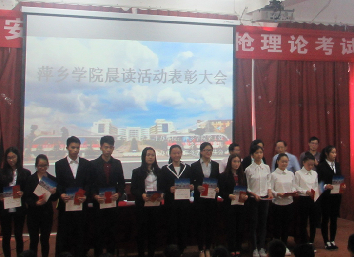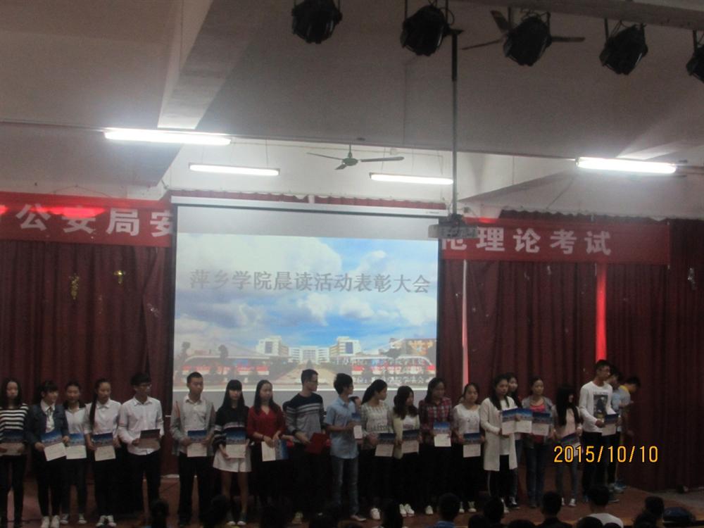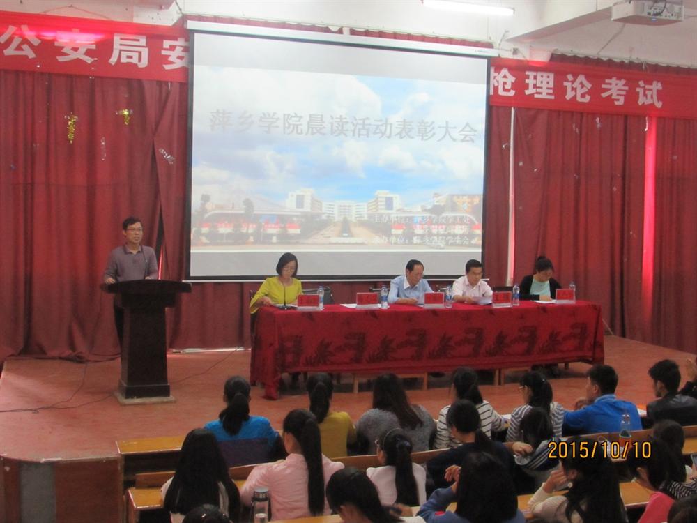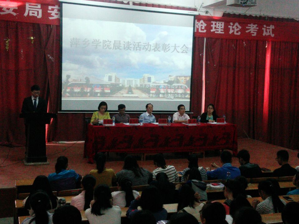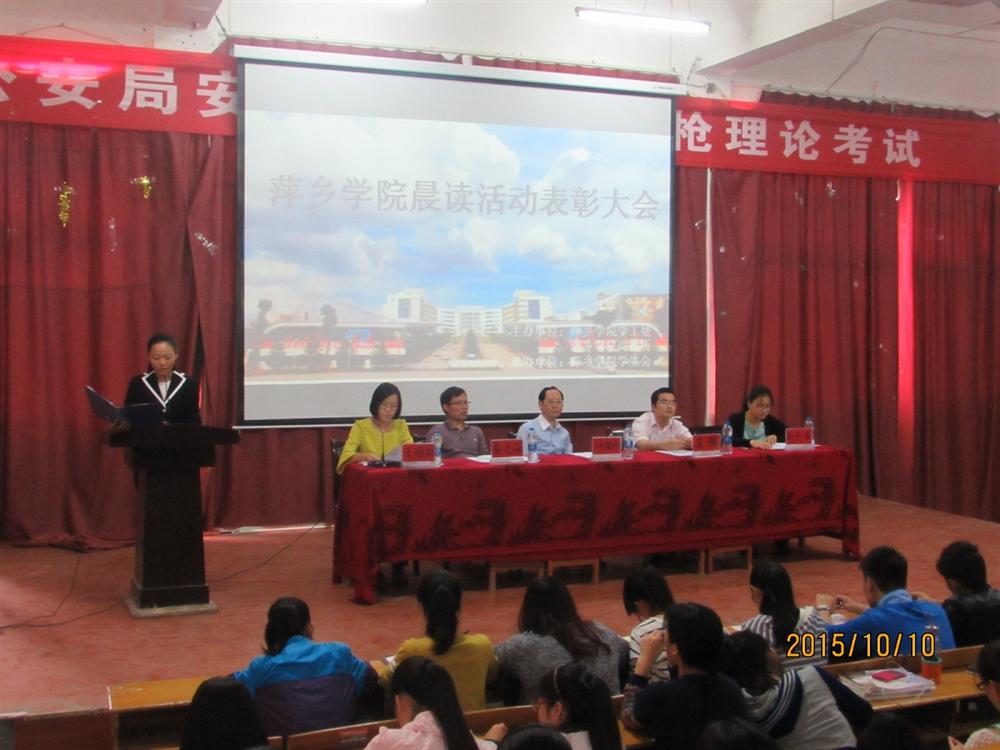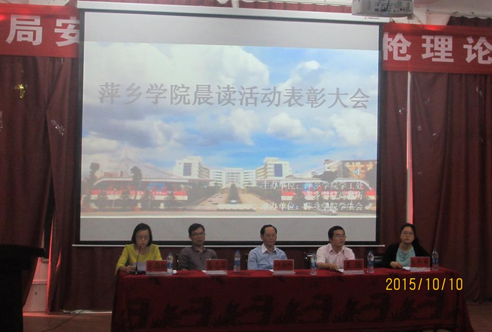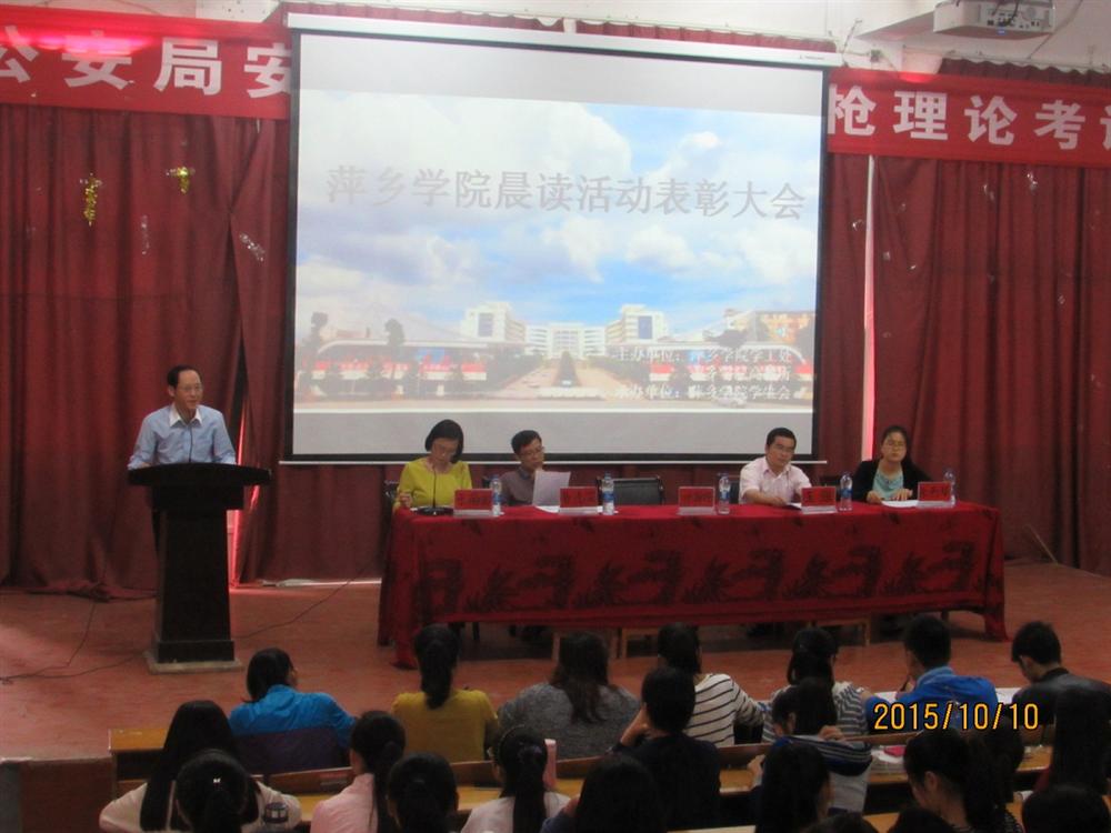 2015年10月10日中午12:40,由学工处和高教研究与质量评估中心主办、校学生会承办的萍乡学院2014-2015学年度晨读活动表彰大会在跬步楼1115隆重举行。出席本次大会的嘉宾有学工处处长叶国许、高教研究与质量评估中心主任易志文、副主任王强、朱艳琴老师及各二级学院的学生代表,大会由校学生会指导老师于丽那主持。